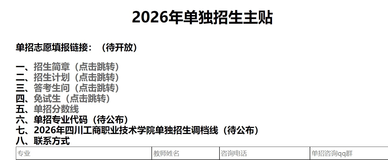 单招志愿填报链接:(待开放)一、招生简章(点击跳转)二、招生计划(点击跳转)三、答考生问(点击跳转)四、免试生(点击跳转)五、单招分数线...