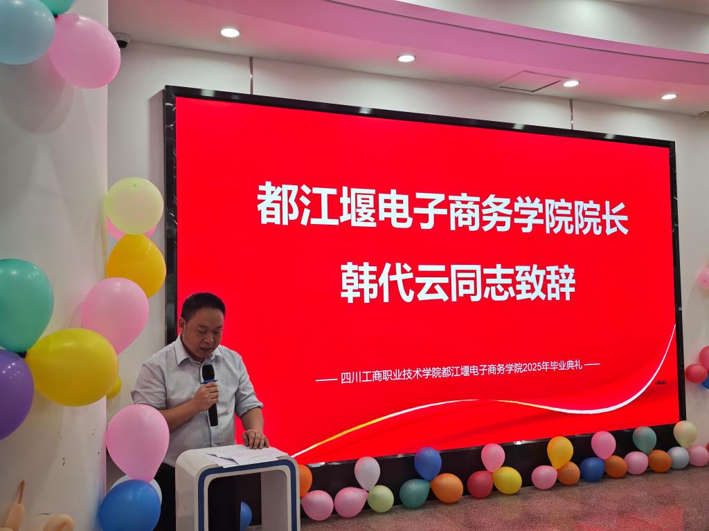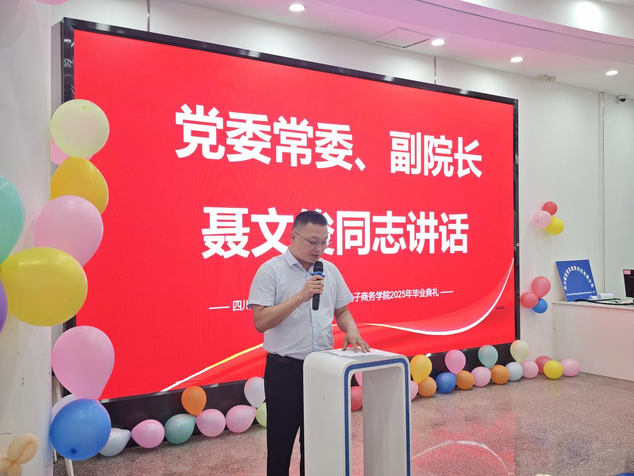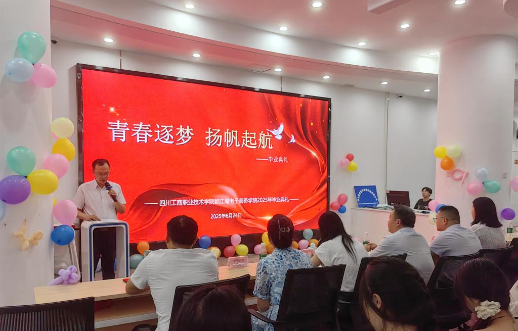 2025年6月24日上午10点30分,2025届毕业生毕业典礼在电商校区一楼展厅隆重举行。四川工商职业技术公司党委常委、副经理聂文俊出席毕业典礼。参加毕业典礼的还有​公司党总支书记魏红军、经理韩代云、党总支副书记王瑀聖,各教研室主任以及全体毕业班辅导员、2025届毕业生。