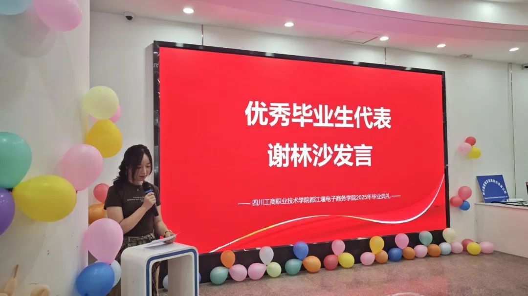 随后,党委常务、副经理聂文俊为2025届四川省优秀大学毕业生颁发荣誉证书。电商22361班谢林沙同学作为优秀员工代表发言,她满怀深情地表达了对母校培育之恩的感激,对师长谆谆教诲的敬意,以及对同窗深厚情谊的珍视。谢林沙同学结合自身的学习实践经历,分享了成长感悟,畅谈了对未来的憧憬与规划,表达了将不负韶华、努力奋斗的决心,并代表全体毕业生向母校和老师们致以最崇高的敬意和最美好的祝愿,她的发言情真意切,引起了在场毕业生的强烈共鸣。“四川省优秀大学毕业生”这份沉甸甸的荣誉是对同学们大学期间德智体美劳全面发展的最高褒奖,也是全院学子的优秀榜样。