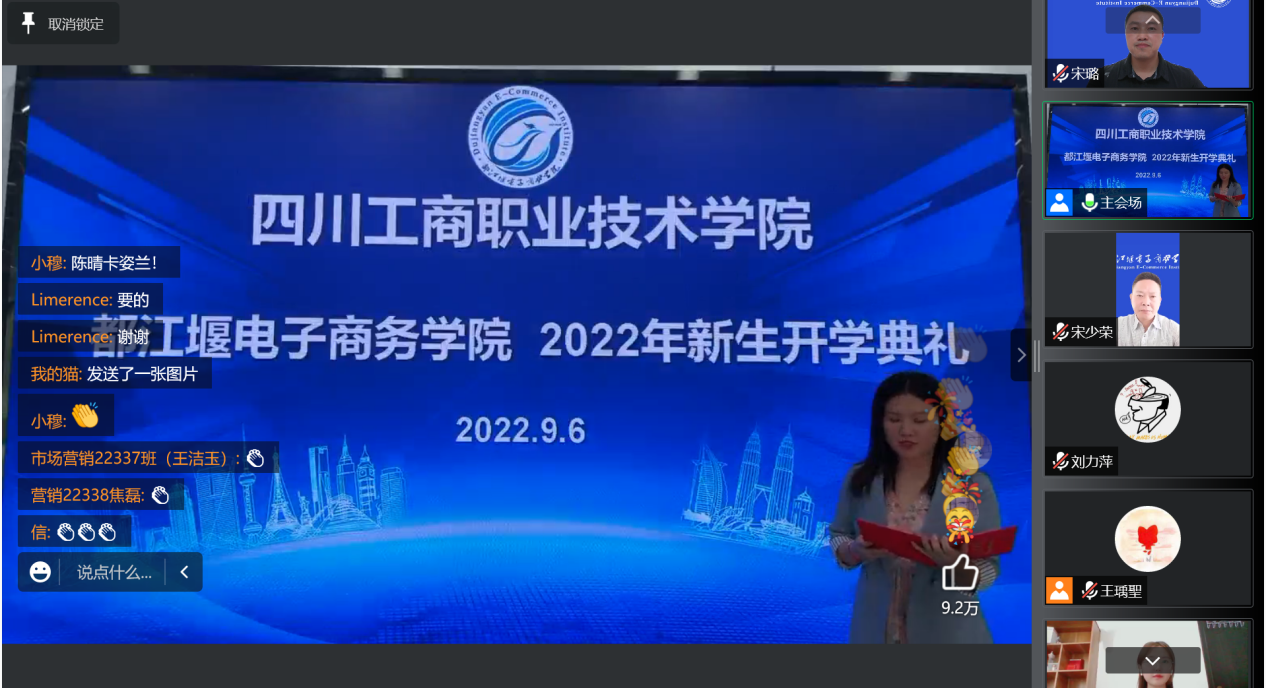 9月6日,2022级新生开学典礼在网络云端隆重举行。公司党总支书记向琼英,党总支副书记、经理宋少荣,党总支副书记、副经理宋璐,党总支书记助理王瑀聖,经理助理刘力萍,各教研室老师、辅导员以及已经报到的514名2022级新生参加大会。大会由党总支书记助理王瑀聖主持。典礼在庄严的国歌声中拉开帷幕。