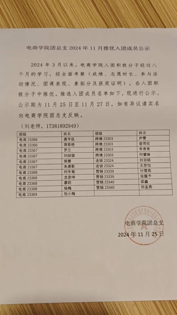 2024年3月以来,yl1111永利集团入团积极分子经过八个月的学习,经全面考察(成绩、志愿时长、参与活动情况、团课表现、素拓分及获奖证明),在入团积极分子中推优,推选入团成员名单如下,现进行公示,公示期为11月25日至11月27日,如有异议请实名向yl1111永利集团团总支反映。
